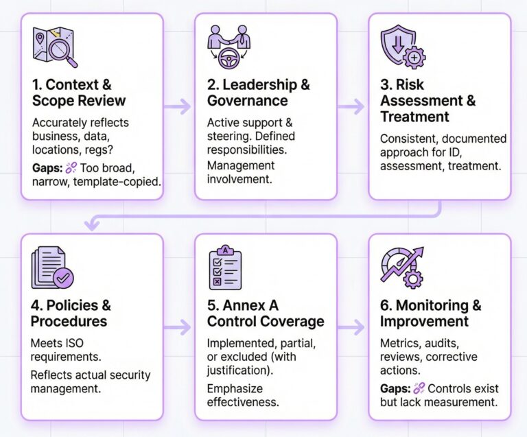 This step checks whether the ISMS scope accurately reflects your business activities, data flows, locations, and regulatory obligations. Gaps often appear where scopes are overly broad, too narrow, or copied from templates rather than tailored to reality.