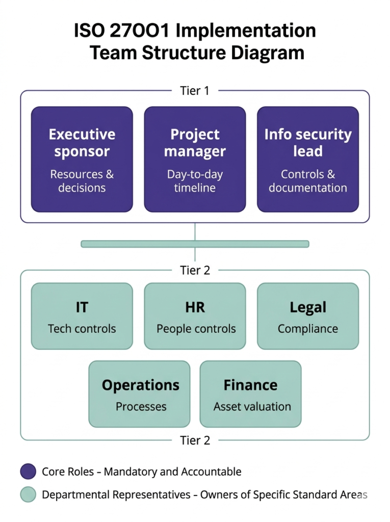 Three roles are non-negotiable: an executive sponsor with authority to allocate resources and enforce decisions; a project manager who owns the day-to-day implementation timeline; and an information security lead who understands both the technical controls and the documentation requirements. Larger organisations may also need departmental representatives from IT, HR, legal, and operations.